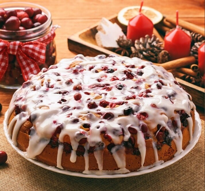 Остывший пирог покрывают глазурью и украшают свежей клюквой.