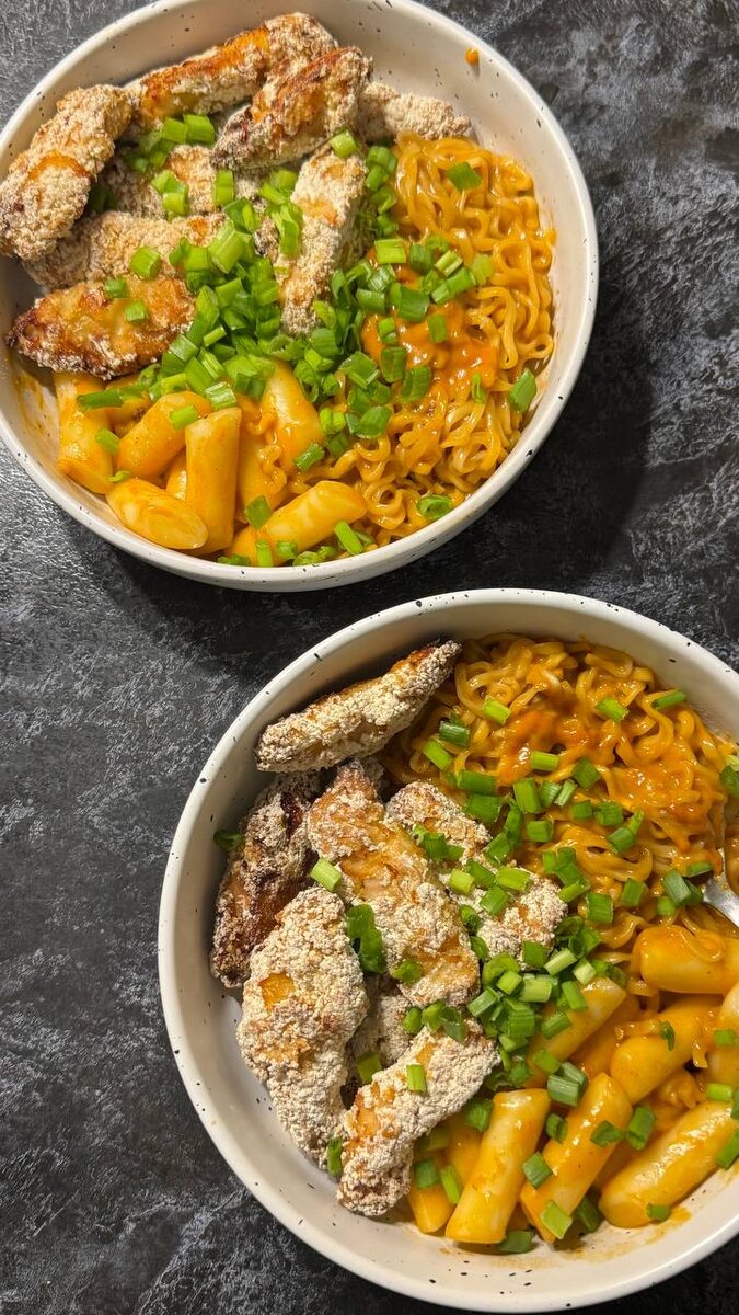 Куриное филе нарезать на тонкие слайсы, добавить немного соли, обвалять в панировочных сухарях и запекать в духовке при температуре 200 градусов около 20 минут. Важно следить, чтобы не пересушить курицу. При желании можно использовать наггетсы вместо филе.В сковороде довести до кипения воду, добавить чан рамён и токпокки. Варить около 5 минут, чтобы вся влага впиталась в ингредиенты.В сковороду добавить специи из чан рамёна, соус Булдак и сыр Чеддер. Тщательно перемешать до получения однородной массы.Готовое блюдо выложить на тарелку, сверху красиво разместить запеченное куриное филе и, если хочется, украсить кольцами зеленого лука. Приятного аппетита!Примечание: многие предпочитают готовить это блюдо без токпокки, и это тоже отличный вариант.