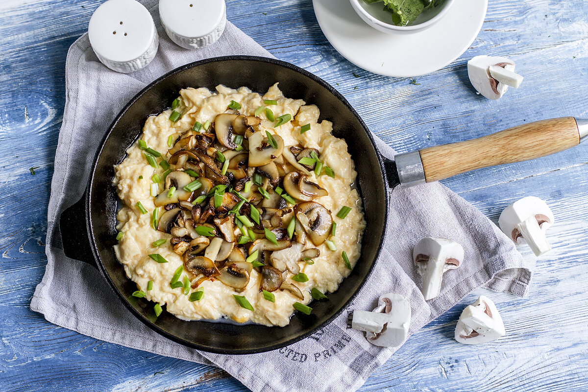 Эта версия известного скрэмбла станет настоящей находкой для любителей грибов. Для создания легкой и воздушной текстуры важно взбивать яйца непосредственно перед приготовлением.