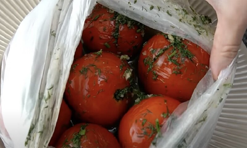Сложите помидоры в пакеты, добавив остатки начинки и выделившийся сок, после чего плотно закройте пакеты и уберите в холодильник. Хотя минимальное время маринования составляет 3-4 часа, оставив помидоры на ночь, можно достичь еще более насыщенного вкуса. Если же хочется остроты, смело добавьте кусочки свежего перца чили или немножко острого перца в маринад.