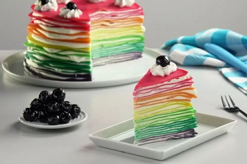 Блины изготавливаются с добавлением красителей, затем торт собирается и убирается в холодильник. Идея простая, но обеспечивает отличный результат!