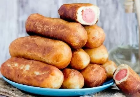 Каждый кусочек теста раскатайте в тонкую лепёшку, в центр положите сосиску и тщательно закройте края, чтобы начинка была полностью закрыта. Разогрейте масло в глубокой сковороде и жарьте пирожки с обеих сторон до золотистой корочки, следя за температурой, чтобы тесто пропеклось внутри, а корочка не подгорела.