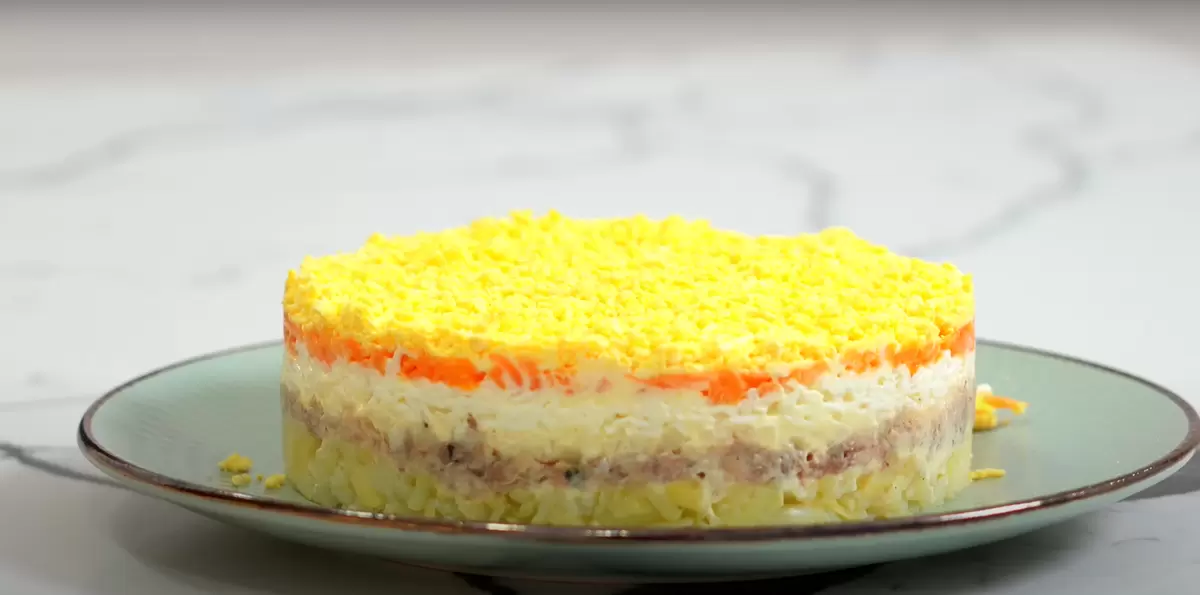 После картофеля равномерно распределяется измельченная сардина, далее выкладывается нарезанный лук, добавляющий приятную остроту. Затем слой тертых белков, слегка подсоленных, и снова майонез. Завершает композицию тертая морковь — не обязательно использовать её всю, чтобы не перебить баланс вкуса. Помимо этого, для украшения используют тертые желтки, добавляя нарезанную зелень по вкусу. После сборки салат лучше всего убрать в холодильник на 1-2 часа, чтобы все ароматы смешались, а слои стали более сочными.