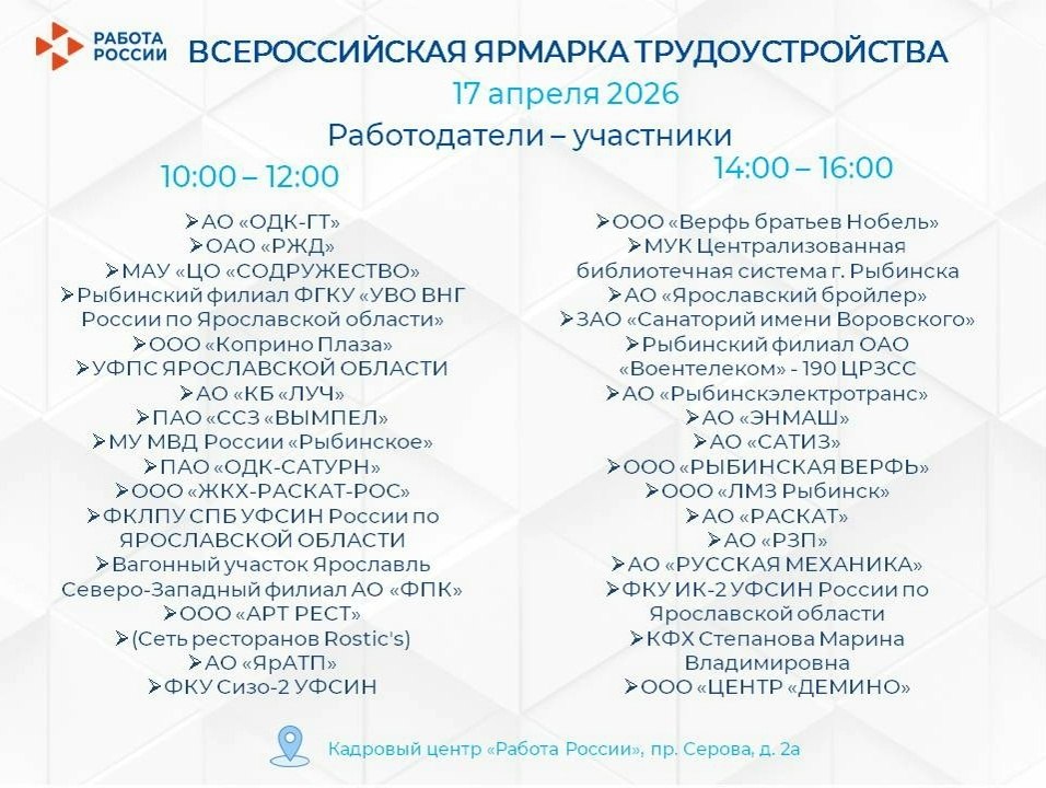 17 апреля в кадровом центре города Рыбинска (проспект Серова, 2 а) более 30 предприятий и организаций представят соискателям свои вакансии.