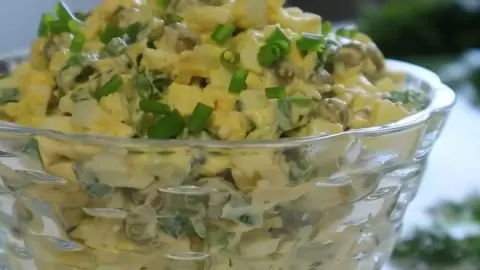 3. Далее в салат добавляется консервированный зелёный горошек и нарезанный пучок зелёного лука. Не забудьте посолить, поперчить и заправить всё майонезом.