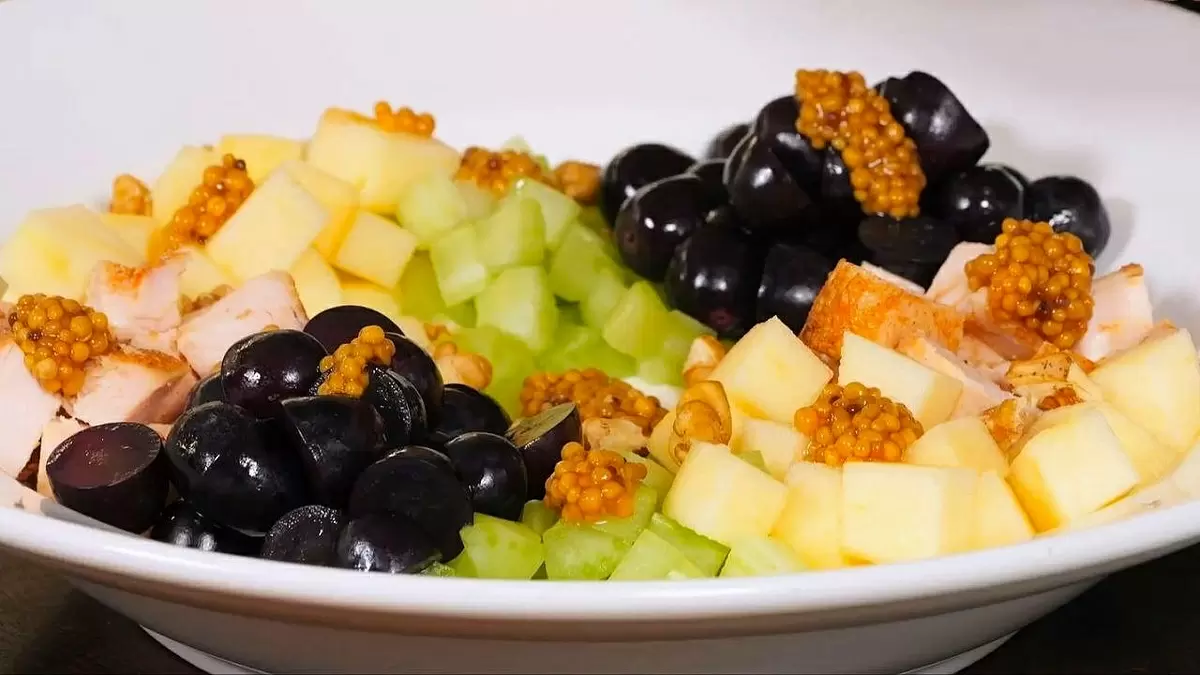 Салат Вальдорф – это не только классика, но и настоящее украшение новогоднего стола. Яркие ингредиенты, красиво выложенные на блюде, создают праздничное настроение и привлекают внимание гостей. Обычно ингредиенты располагаются на соусе, что придаёт блюду особую эстетику, а финальное смешивание только добавляет шарма.