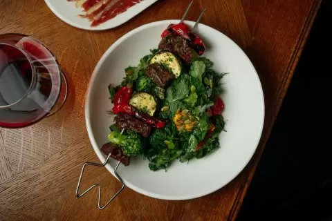 На морозном фоне весенней природы выделяется удивительное блюдо из меню Urban Winery – шашлык из говядины и овощей с ярким травяным салатом. Это не просто еда, а настоящий кулинарный шедевр, который передает атмосферу теплых дней.
