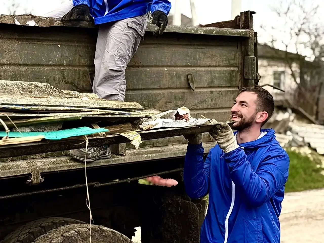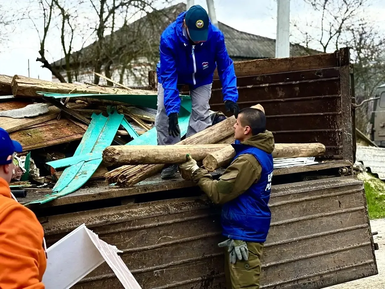 Участники лагеря оказывают помощь в разборе оставшихся завалов на пред домовой территории, а также в уборке поврежденного шифера.