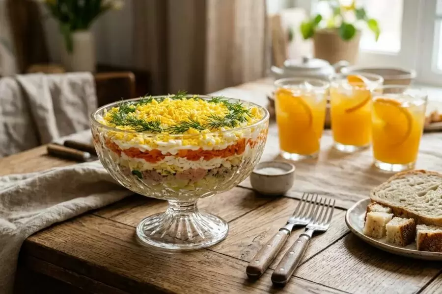 Салат «Мимоза» — это не просто закуска, а настоящая кулинарная классика, которая займёт почётное место на любом столе. Этот салат, ставший неотъемлемой частью новогоднего застолья и других торжеств, радует своей нежной текстурой и яркими цветами, напоминающими весенние веточки мимозы, что и послужило вдохновением для его названия. В традиционном варианте в его состав входят консервированная рыба, отварные овощи и, конечно, майонез, который делает вкус салата особенно гармоничным.