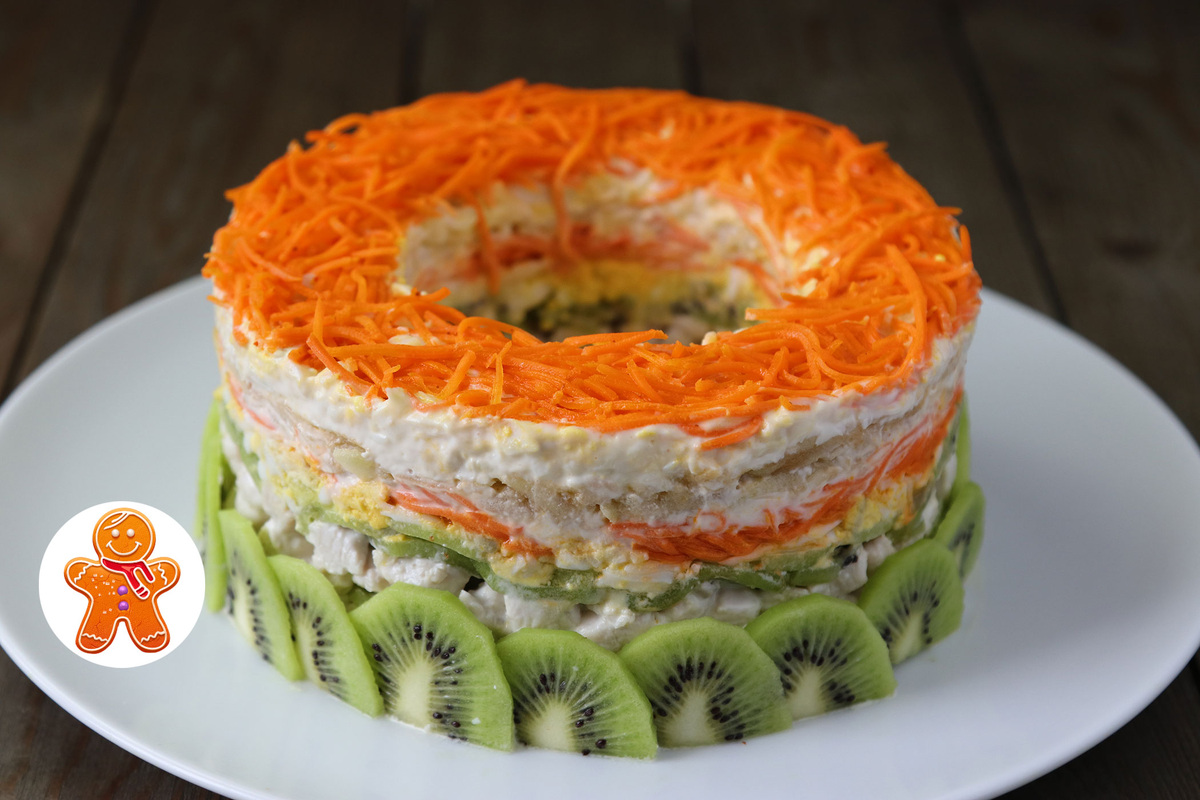 Салат «Изумрудный» привлекает внимание не только своим ярким видом, но и уникальным сочетанием ингредиентов. В его состав входят отварная курица, яблоко, киви, морковь по-корейски и немного чеснока, что создает интересный вкусовой баланс. Этот салат станет ярким акцентом на любом праздничном столе.