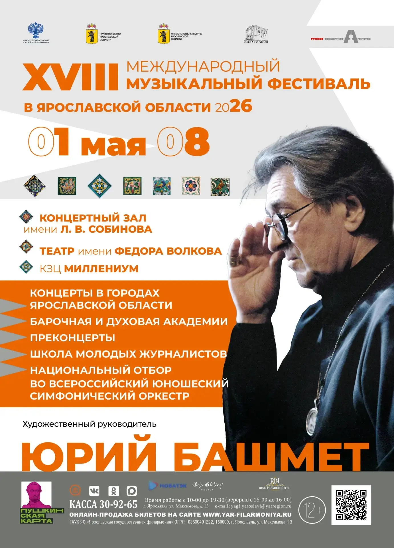 С 1 по 8 мая в Ярославле и городах области состоится XVIII Международный музыкальный фестиваль под руководством Юрия Башмета. Откроется фестиваль 1 мая гала-концертом в филармонии, посвященным юбилею Моцарта. В дни фестиваля выступления также пройдут в Волковском театре, КЗЦ «Миллениум», санатории «Сосновый бор» и в музее-заповеднике «Карабиха». Запланированы концерты и в других городах региона: в Рыбинске, Угличе, Мышкине, Данилове, Ростове Великом.