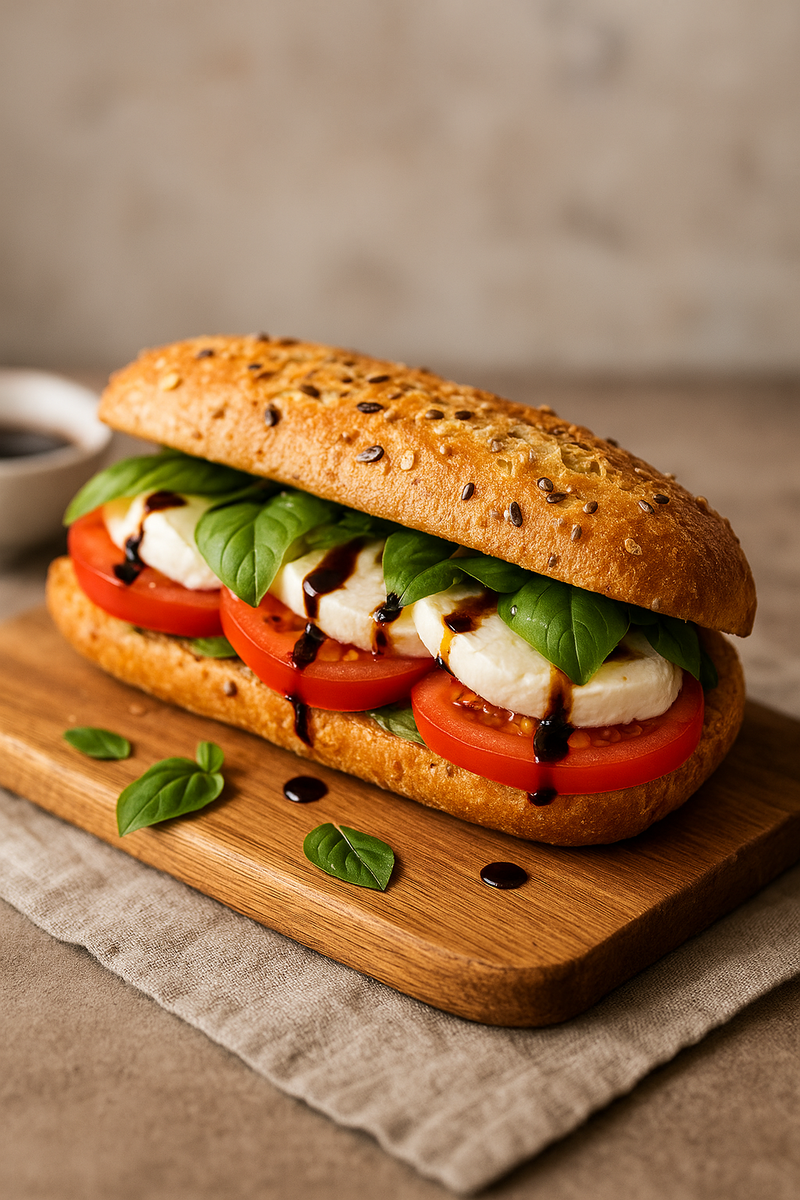 - Итальянский капрезе в багете: свежая моцарелла, помидоры и базилик, заправленные оливковым маслом и бальзамиком, в хрустящей чиабатте или багете.